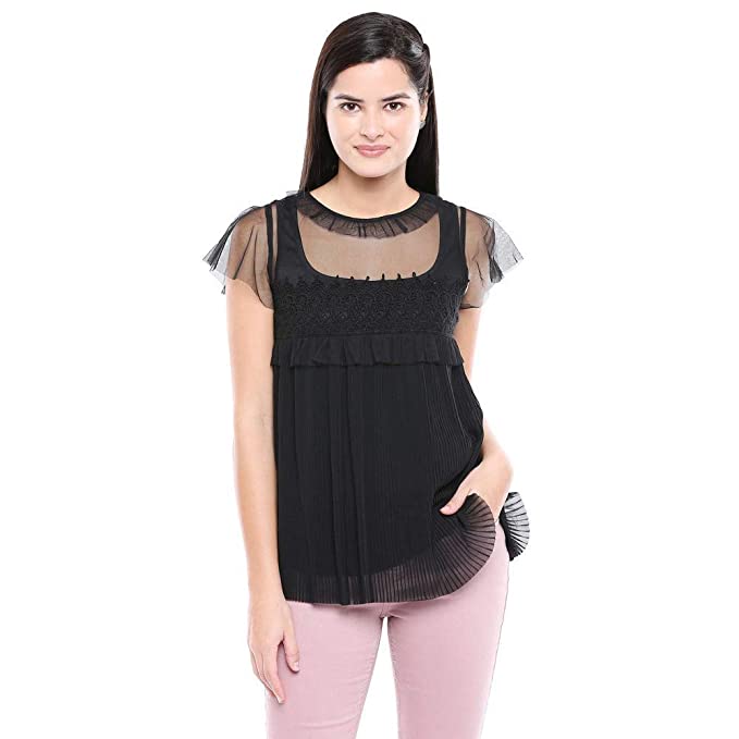 VERO MODA Womens Round Neck Solid Lace Yoke Top